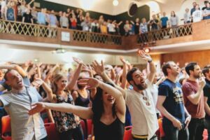 من أبرز هذه المحاولات «تجمّع الأحد» (Sunday Assembly)، وهو لقاء أسبوعي منتظم صباح الأحد في لندن يخلو من أي إشارة إلى الله أو الروحانية. يتجنبون عمدًا المشاعر المعادية للدين، بل على العكس، يستعيرون بعض عناصر التقليد المسيحي: ترانيم حديثة، محاضرة ملهمة عن عظمة الكون تحل محل العظة، وتأمل في الحب يحل محل وقت الصلاة. والأهم أنه جمع الناس معًا في مجتمع أسبوعي منتظم. لقد كان نسخة موازية من الكنيسة. حتى أن كثيرين وصفوه بـ «الكنيسة الملحدة»، لكن شعاره الوحيد كان القيم المذكورة على موقعه: «عِش أفضل، ساعد أكثر، وتأمل أكثر».44 بل إن أول الاجتماعات التي عقدوها كانت في مقر كنسية بالفعل، حتى زاد العدد فاضطروا إلى الانتقال إلى مكان آخر.